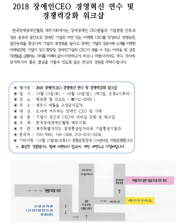 공지사항 2018 장애인CEO경영혁신 연수 및 경쟁력 강화 워크샵(참석여부 확인 부탁 최고관리자 0 2018-09-06 13:30:00 1,934 참석여부를 꼭 알려주시길 부탁드립니다. 2019년도 경쟁력강화 및 경영애로 지원사업 참가 신청모집 및 회비납부 안내!!!! 제19호 태풍'솔릭'재해 중소기업 및 소상공인 지원 (태풍피해신고) 목록보기 지회소개 인사말 지회개요 지회연혁 조직도 오시는길 주요사업 판로지원및공동구매 장애경제인위상제고 장애기업창업촉진 정책개발/홍보 경영애로상담 소액수의계약 추천제도 참여안내 후원안내 회원안내 커뮤니티 1:1상담 알림마당 공지사항 협회소식 보도자료 지회갤러리 자료실 신청서 장애인기업법 기타