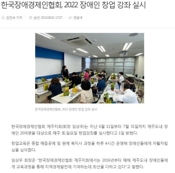 보도자료 2022 뉴스n제주 보도자료 - 온라인쇼핑몰 관련 관리자 0 2022-08-11 16:24:34 1,309 2022 뉴스n제주 보도자료 - 온라인쇼핑몰 관련자료 입니다 2023 손영준 자문위원 제주자원봉사센터장 취임 광고게재-한라일보 뉴제주일보 보도자료(7월27일) 목록보기 지회소개 인사말 지회개요 지회연혁 조직도 오시는길 주요사업 판로지원및공동구매 장애경제인위상제고 장애기업창업촉진 정책개발/홍보 경영애로상담 소액수의계약 추천제도 참여안내 후원안내 회원안내 커뮤니티 1:1상담 알림마당 공지사항 협회소식 보도자료 지회갤러리 자료실 신청서 장애인기업법 기타